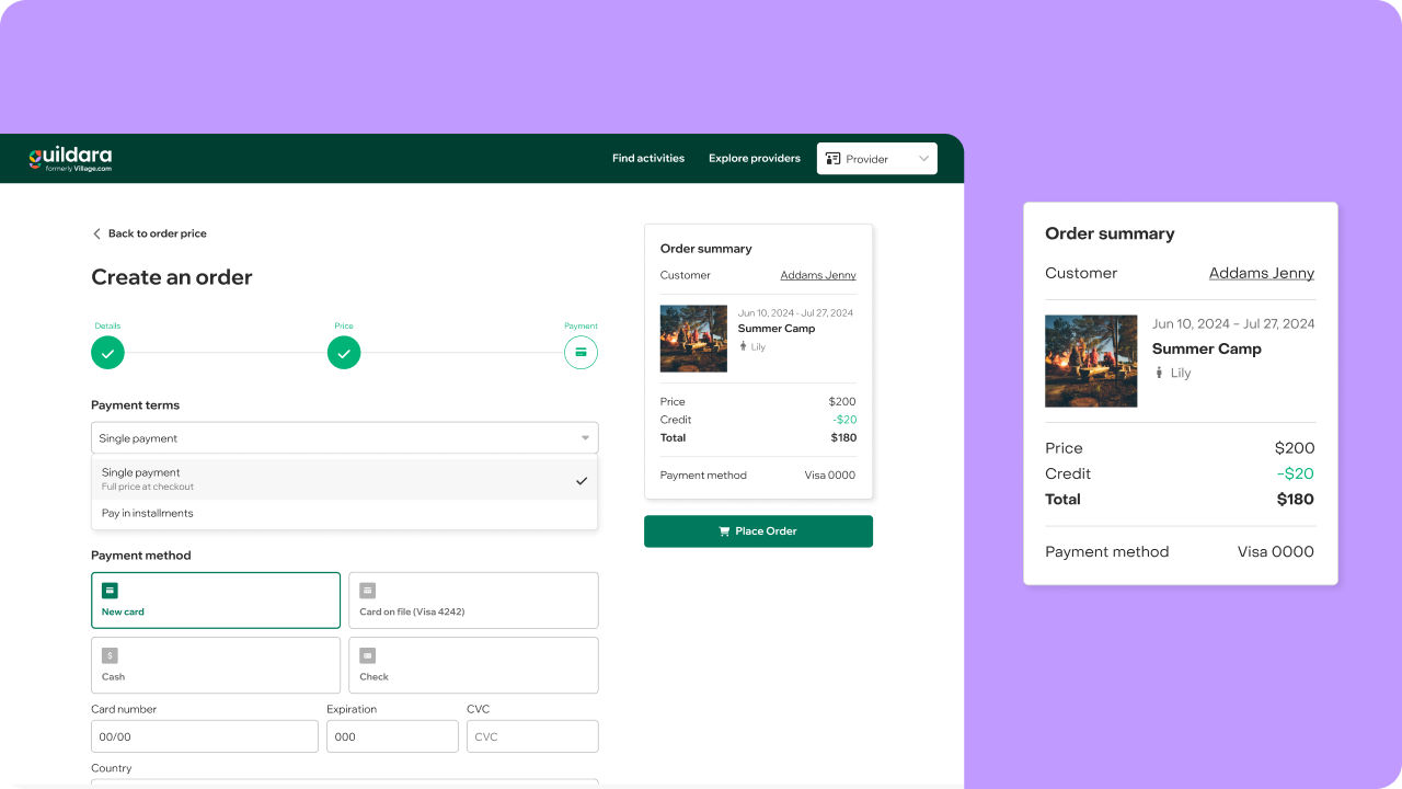 Finally, request the customer's payment card information to complete the order. You can also use the card on file if the customer has a saved payment method on their Guildara account.